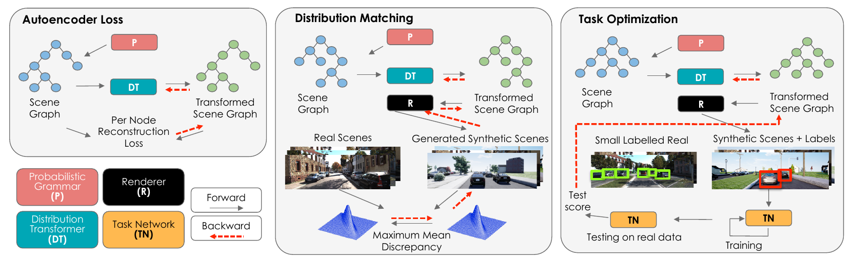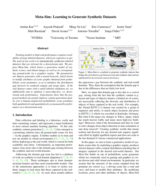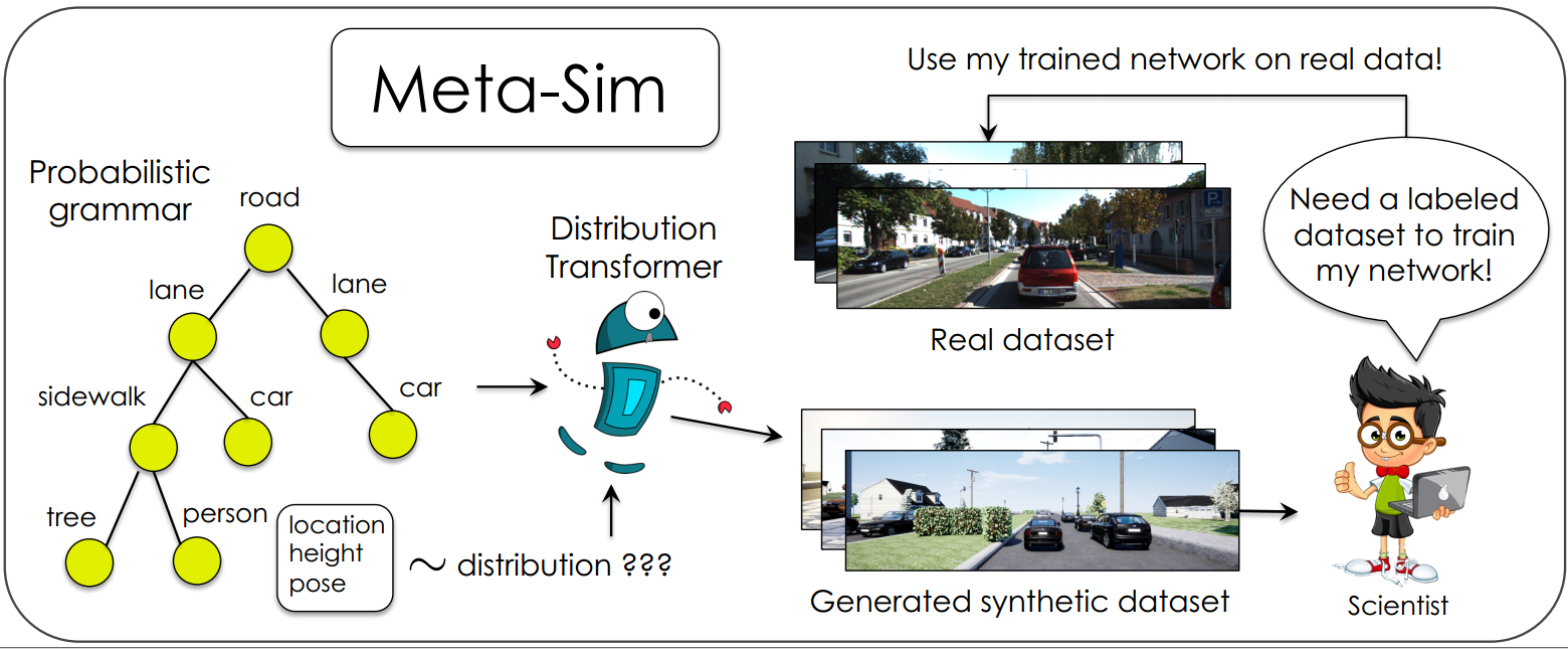 Training models to high-end performance requires availability of large labeled datasets, which are expensive to get. The goal of our work is to automatically synthesize labeled datasets that are relevant for a downstream task. We propose Meta-Sim, which learns a generative model of synthetic scenes, and obtain images as well as its corresponding ground-truth via a graphics engine. We parametrize our dataset generator with a neural network, which learns to modify attributes of scene graphs obtained from probabilistic scene grammars, so as to minimize the distribution gap between its rendered outputs and target data. If the real dataset comes with a small labeled validation set, we additionally aim to optimize a meta-objective, i.e. downstream task performance. Experiments show that the proposed method can greatly improve content generation quality over a human-engineered probabilistic scene grammar, both qualitatively and quantitatively as measured by performance on a downstream task.